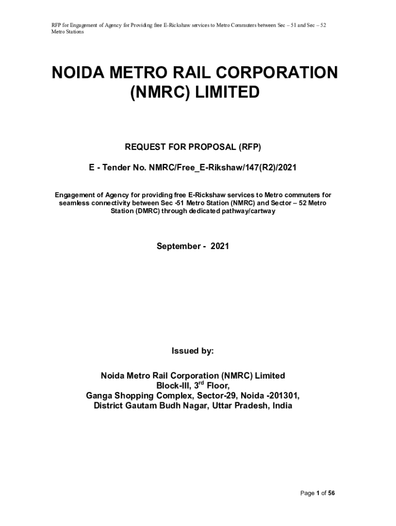 RFP for Engagement of Agency for Providing free Rickshaw services to Metro Commuters between Sec 51 and Sec 52