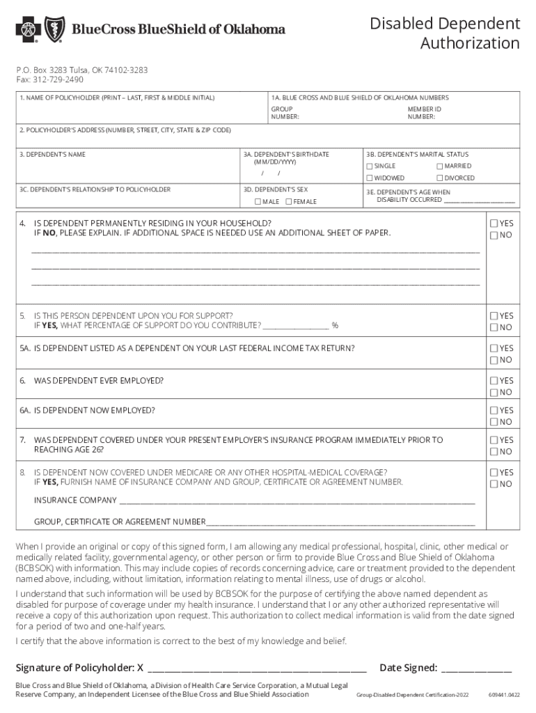 Agentsbcbsokcomgrp-disabled-dependent-form-okdisabled dependent authorization is typically needed by individuals who have disabled dependents and want to provide them with health insurance coverage.