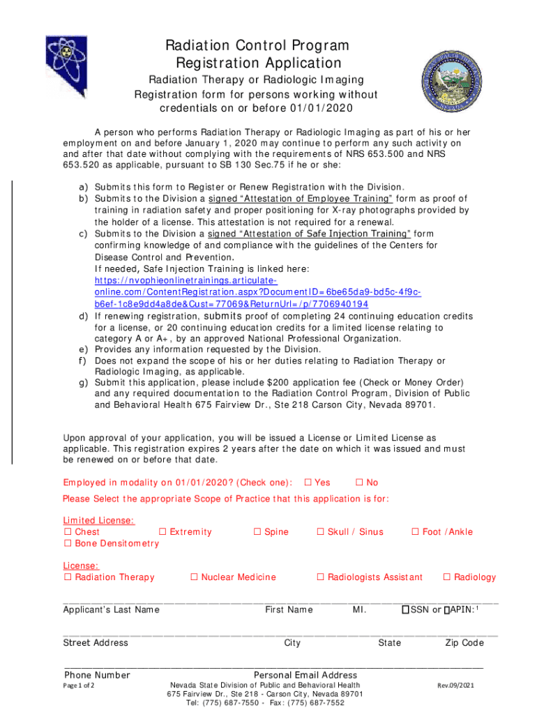 Radiation Control Program Registration ApplicationRadiation Therapy or Radiologic Imaging Registration form for persons working without credentials on or before 01/01/2020 A person who performs Radiation