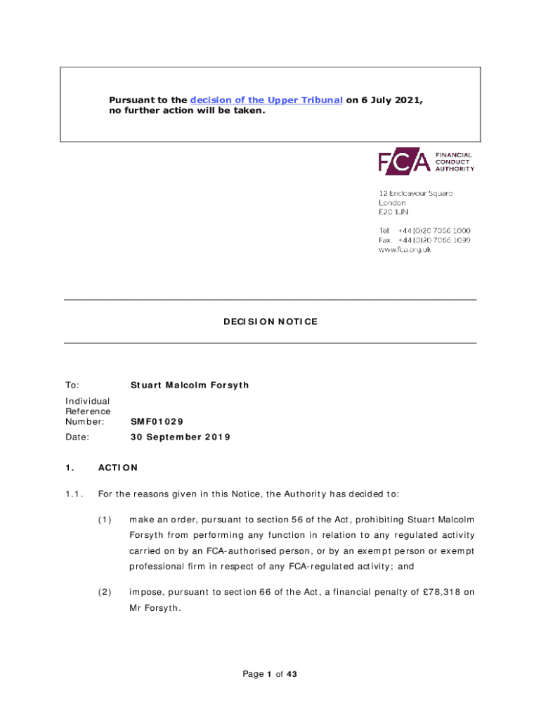 Pursuant to the decision of the Upper Tribunal on 6 July 2021, no further action will be taken. DECISION Notice:Stuart Malcolm ForsythIndividual Reference Number:SMF01029Date:30 September 20191.ACTION1.1.