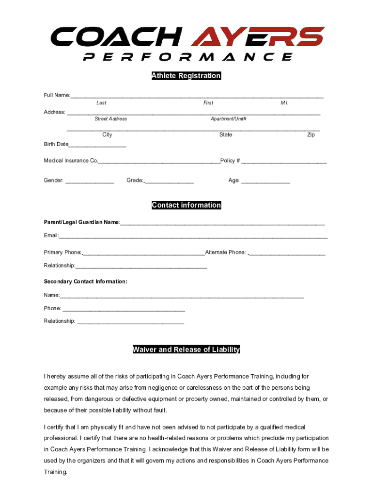 Athlete Registration Full Name:___ LastFirstM. I. Address: ___ Street AddressApartment/Unit#___ City State Zip Birth Date___ Medical Insurance Co.___Policy # ___ Gender: ___Grade: ___Age: ___Contact