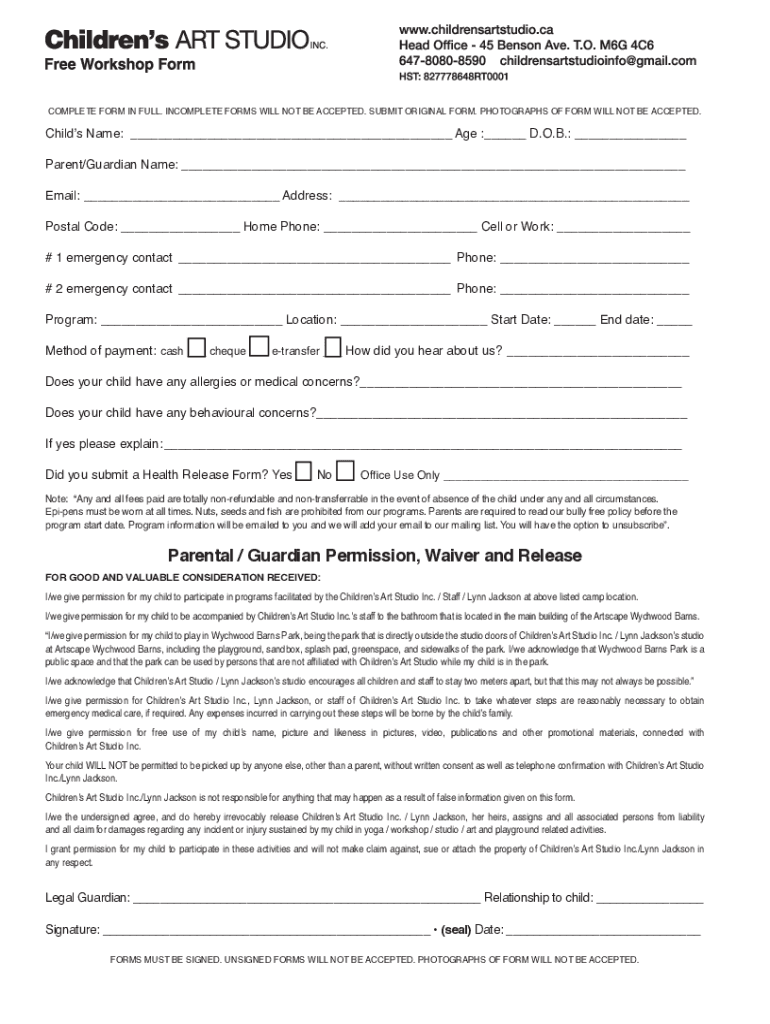 COMPLETE FORM IN FULL. INCOMPLETE FORMS WILL NOT BE ACCEPTED. SUBMIT ORIGINAL FORM. PHOTOGRAPHS OF FORM WILL NOT BE ACCEPTED. Child's Name: ___ Age :___ D.O.B.: ___ Parent/Guardian Name: ___ Email: