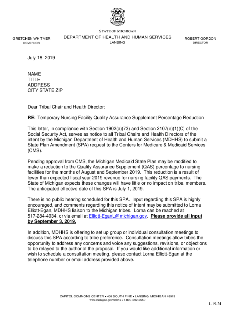 STATE OF MICHIGAN GRETCHEN WHITMERDEPARTMENT OF HEALTH AND HUMAN SERVICESROBERT GORDONGOVERNORLANSINGDIRECTORJuly 18, 2019NAME TITLE ADDRESS CITY STATE Zippier Tribal Chair and Health Director: RE:
