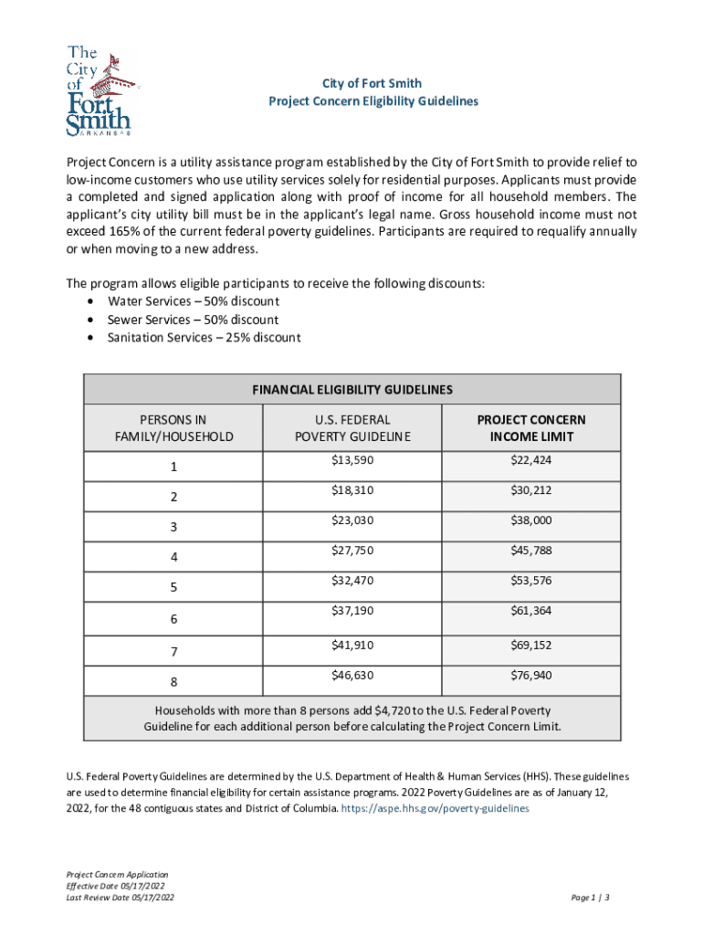 CityofFortSmith ProjectConcernEligibilityGuidelines ProjectConcernisautilityassistanceprogramestablishedbytheCityofFortSmithtoprovidereliefto lowincomecustomerswhouseutilityservicessolelyforresidentialpurposes.