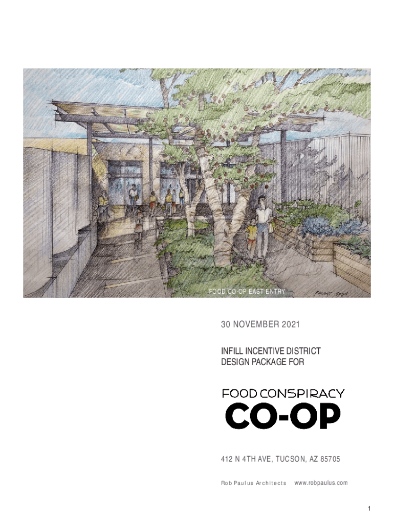 FOOD COOP EAST ENTRY30 NOVEMBER 2021 INFILL INCENTIVE DISTRICT DESIGN PACKAGE FOR412 N 4TH AVE, TUCSON, AZ 85705 Rob Paulus Architects.robpaulus.com 1TABLE OF CONTENTS ContentsAPPLICATION..................................................................................................................................................