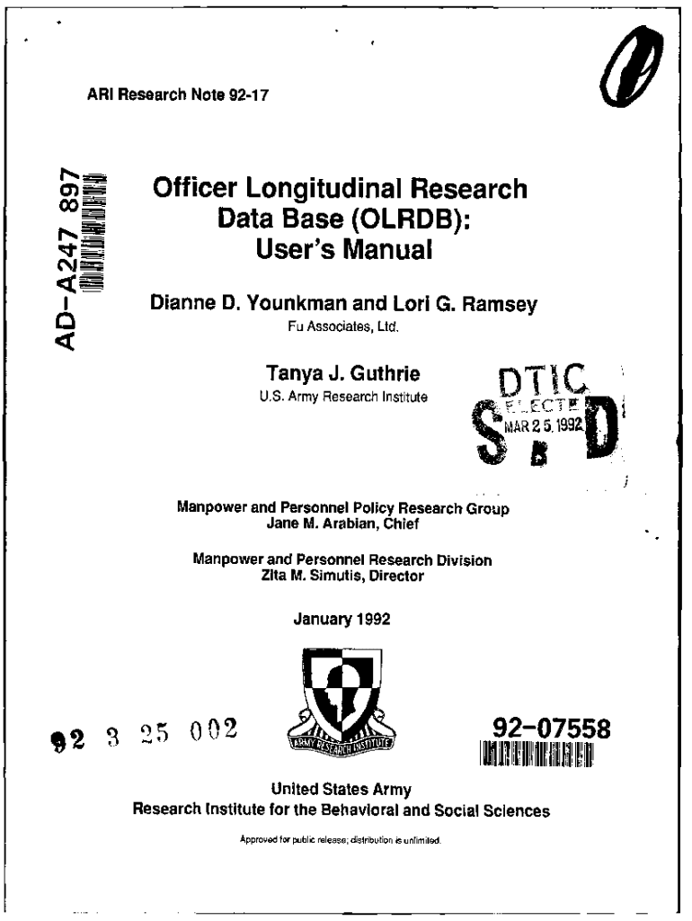 ARI Research Note 9217Officer Longitudinal Research Data Base (OLD): User\'s Manual Dianne D. Gunman and Lori G. Ramsey FM Associates, Ltd. Tanya J. GuthrieDTICU. S. Army Research InstituteIMAR2 5,199Manpower