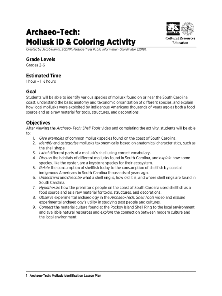 ArchaeoTech: Mollusk ID & Coloring Activity Created by Jacob Hamill, SC DNR Heritage Trust Public Information Coordinator (2019). Grade Levels Grades 26Estimated Time 1 hour 1 hoursGoalStudents will