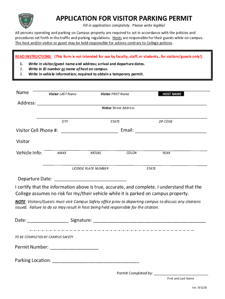 APPLICATION FOR VISITOR PARKING PERMIT Fill in application completely. Please write legibly! All persons operating and parking on Campus property are required to act in accordance with the policies