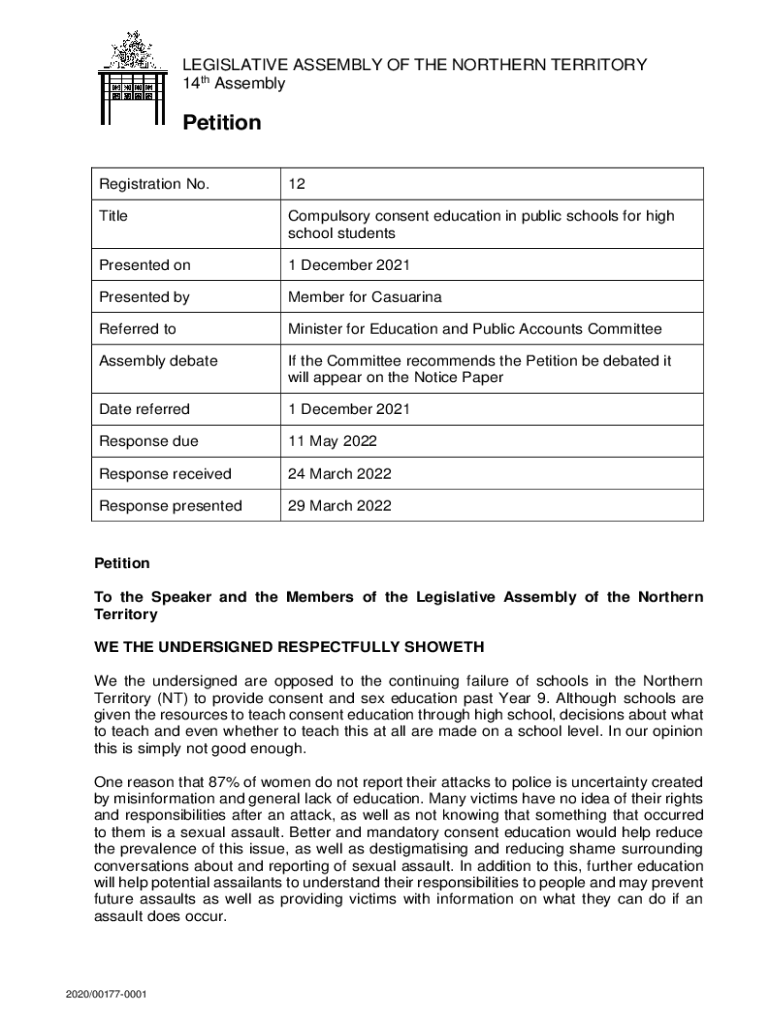 LEGISLATIVE ASSEMBLY OF THE NORTHERN TERRITORY 14th AssemblyPetition Registration No.12TitleCompulsory consent education in public schools for high school studentsPresented on1 December 2021Presented