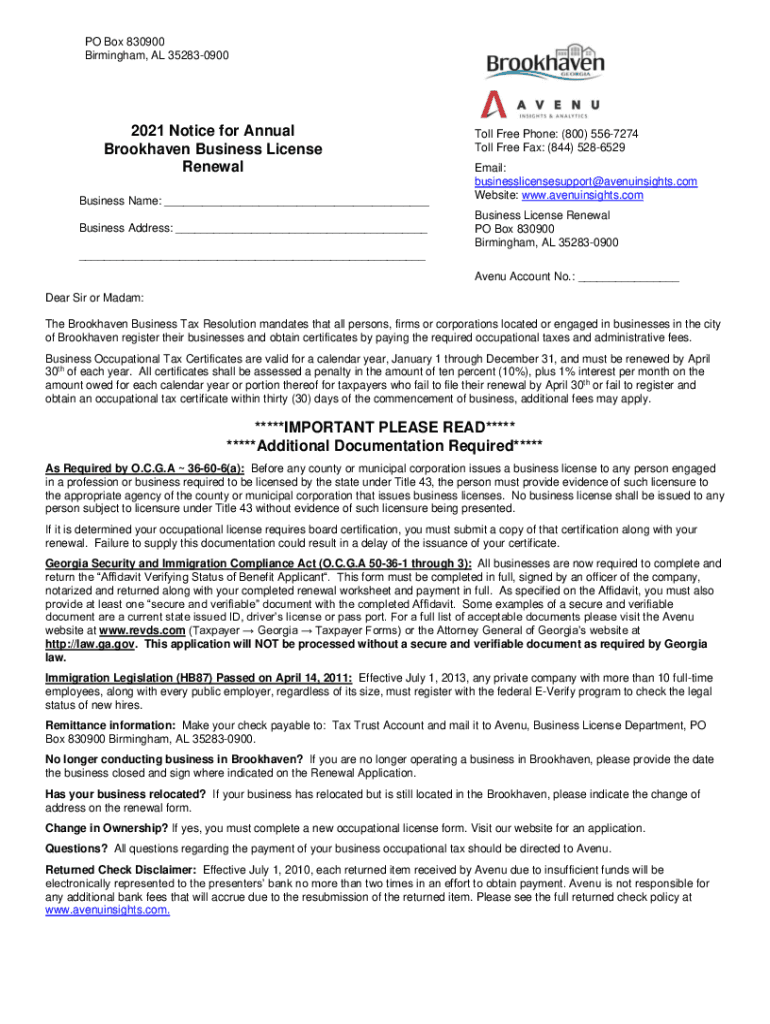 PO Box 830900 Birmingham, AL 3528309002021 Notice for Annual Brookhaven Business License Renewal Business Name: ___ Business Address: ___Toll Free Phone: (800) 5567274 Toll Free Fax: (844) 5286529