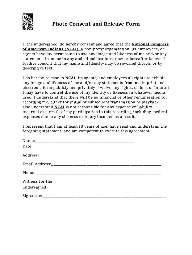 Photo Consent and Release Form, the undersigned, do hereby consent and agree that the National Congress of American Indians (NCAA), a nonprofit organization, its employees, or agents have my permission