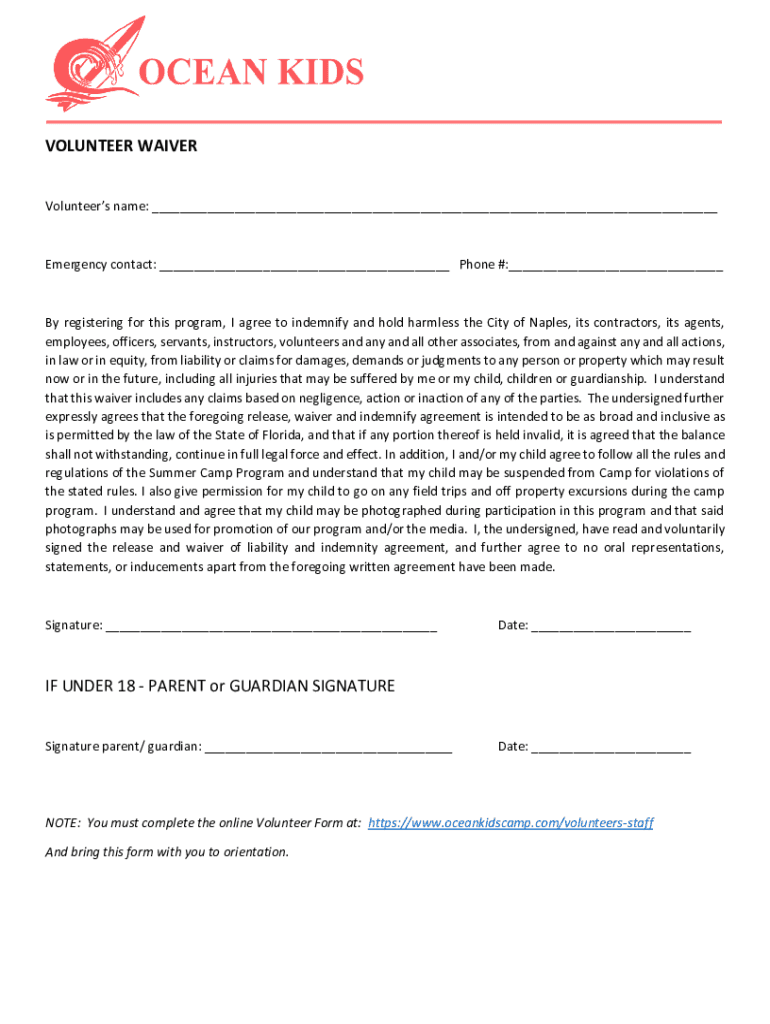 VOLUNTEER WAIVER Volunteers name: ___Emergency contact: ___ Phone #:___By registering for this program, I agree to indemnify and hold harmless the City of Naples, its contractors, its agents, employees,