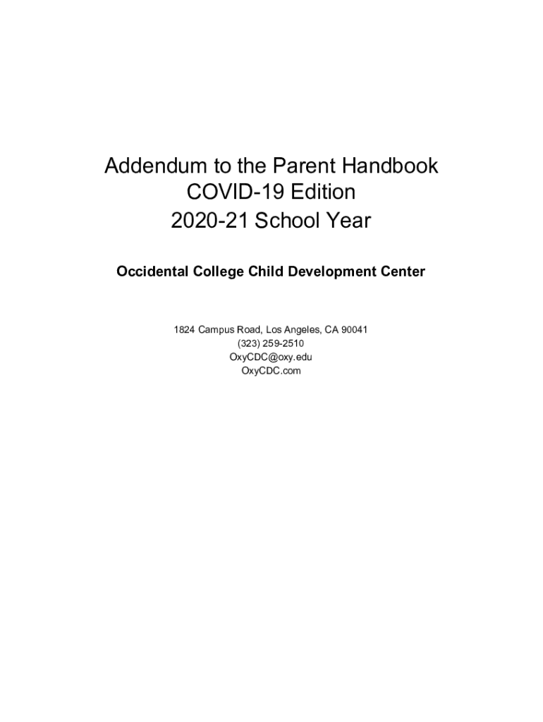 Addendum to the Parent Handbook COVID-19 Edition 202021 School Year Occidental College Child Development Center1824 Campus Road, Los Angeles, CA 90041 (323) 2592510 OxyCDC@oxy.edu Oxygen.com Occidental