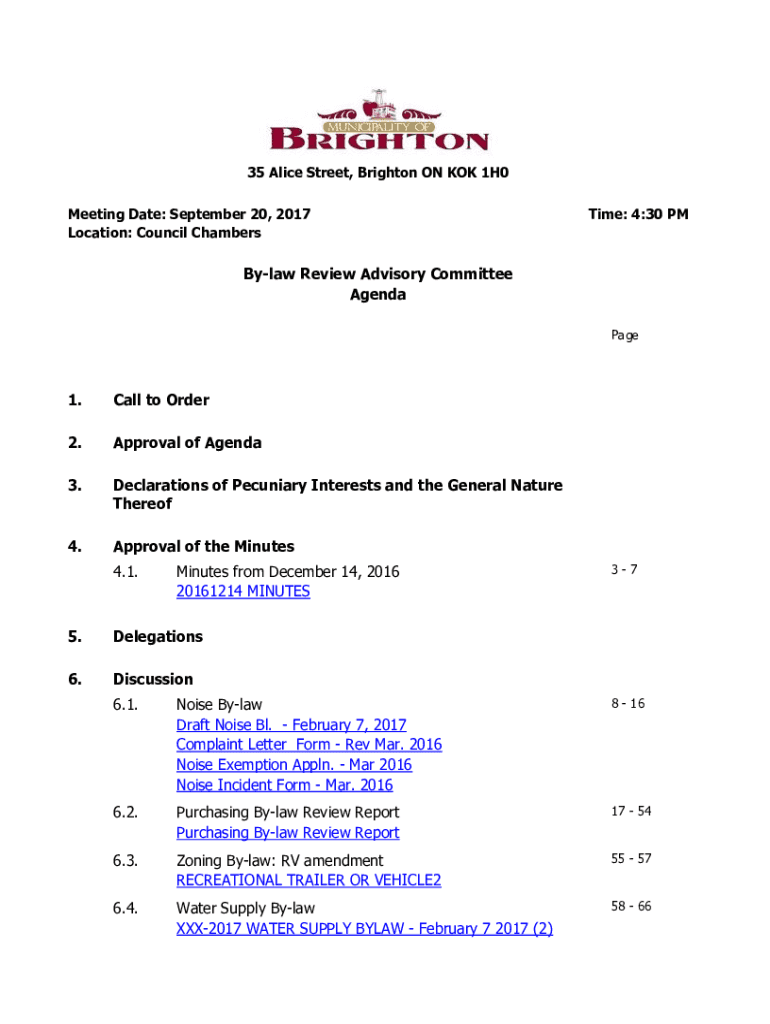 35 Alice Street, Brighton ON KOK 1H0 Meeting Date: September 20, 2017, Location: Council ChambersTime: 4:30 Bylaw Review Advisory Committee Agenda Page1. Call to Order2. Approval of Agenda3. Declarations