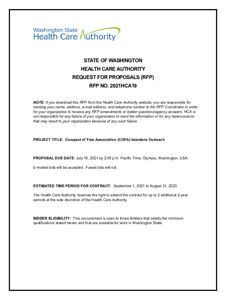 STATE OF WASHINGTON HEALTH CARE AUTHORITY REQUEST FOR PROPOSALS (RFP) RFP NO. 2021HCA19 NOTE: If you download this RFP from the Health Care Authority website, you are responsible for sending your