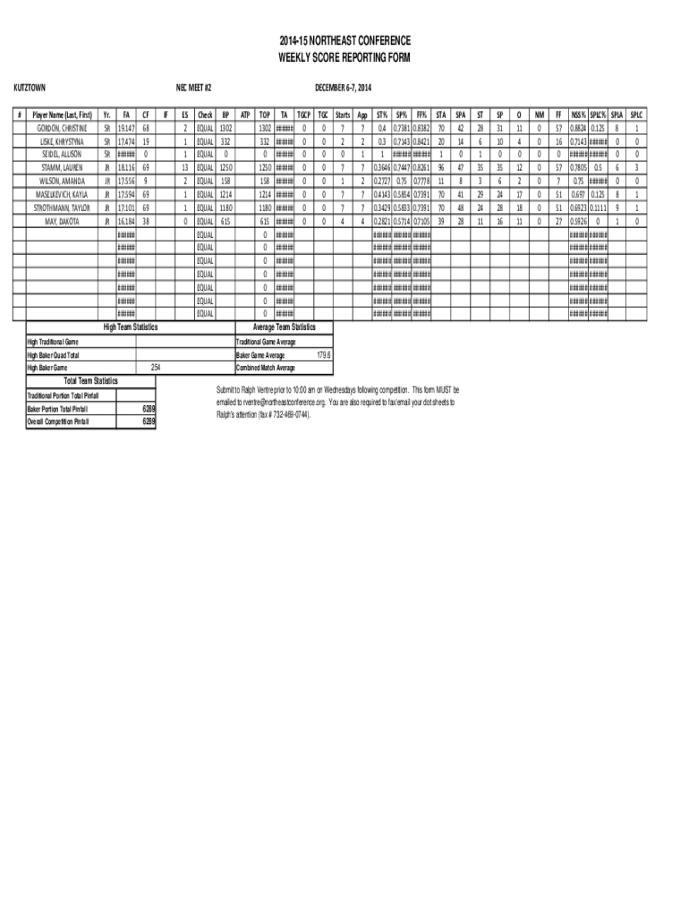 201415 NORTHEAST CONFERENCE WEEKLY SCORE REPORTING FORM BUTTON #E-MEET#2PlayerName(Last, First) GORDON, CHRISTINE LIKE, KRYSTYNA SIDE, ALLISON STAMP, LAUREN WILSON, AMANDA MALKOVICH, KAYLA STRONGMAN,