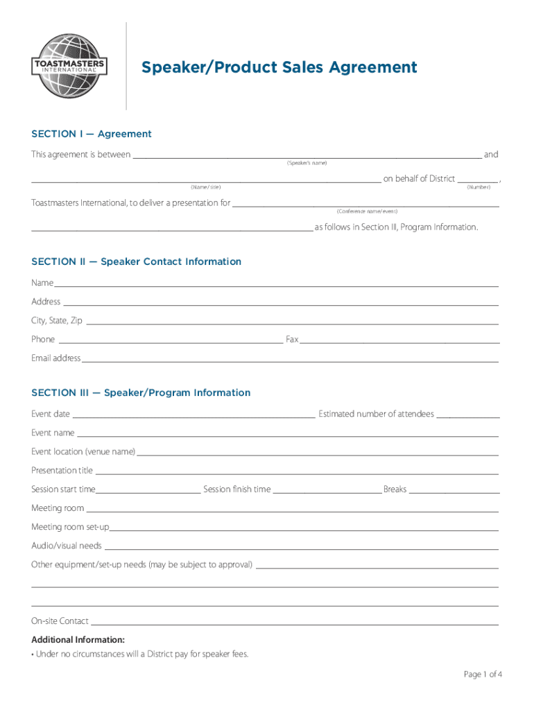 Speaker/Product Sales AgreementSECTION I Agreement This agreement is between ___ and (Speakers name)___ on behalf of District ___, (Name / title)(Number)Toastmasters International, to deliver a presentation