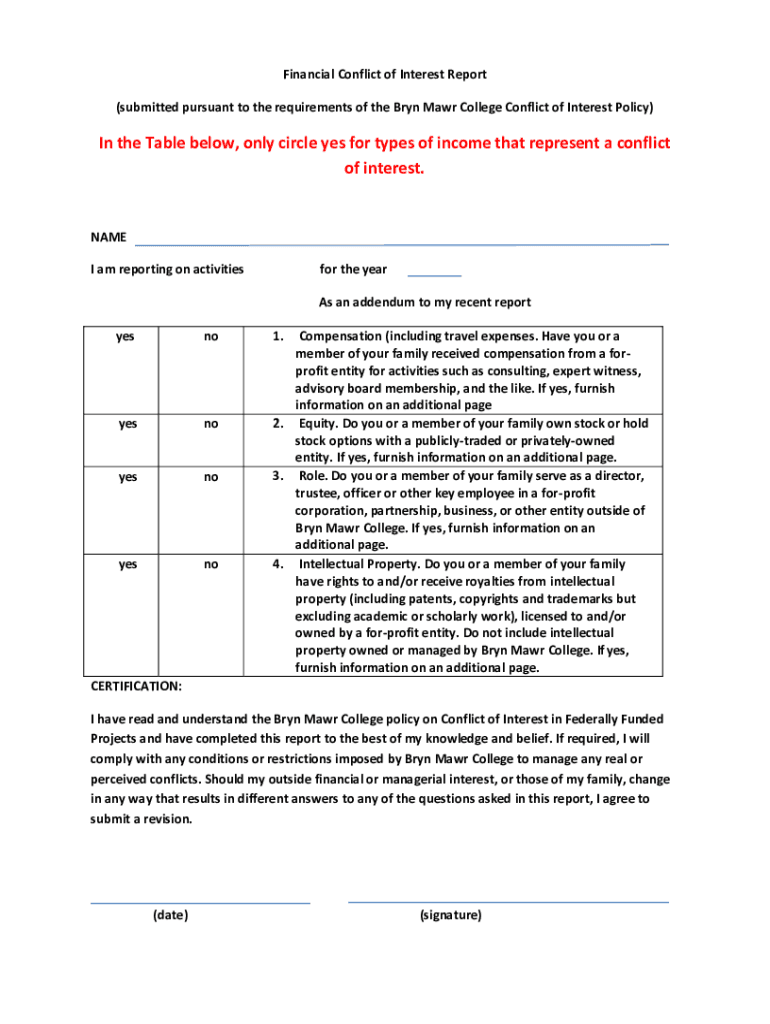 Financial conflict of interest forms typically require individuals to disclose any financial interests or relationships that could potentially create conflicts of interest.