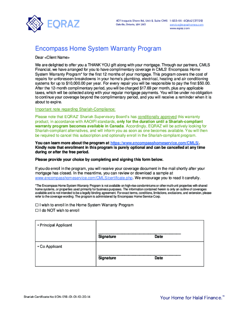 407 Iroquois Shore Rd., Unit 8, Suite CM6 183355 ERA (37729) Oakville, Ontario, L6H 1M3 service@eqrazhomes.com www.eqraz.comEncompass Home System Warranty Program Dear Client Name We are delighted