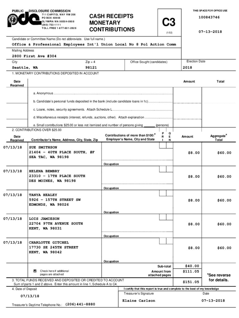 PUBLISHES SPACE FOR OFFICE DISCLOSURE COMMISSION 711 CAPITOL WAY RM 206 PO BOX 40908 OLYMPIA WA 985040908 (360) 7531111 TOLL FREE 18776012828C3CASH RECEIPTS MONETARY CONTRIBUTIONS10084374607132018(1/02)Candidate