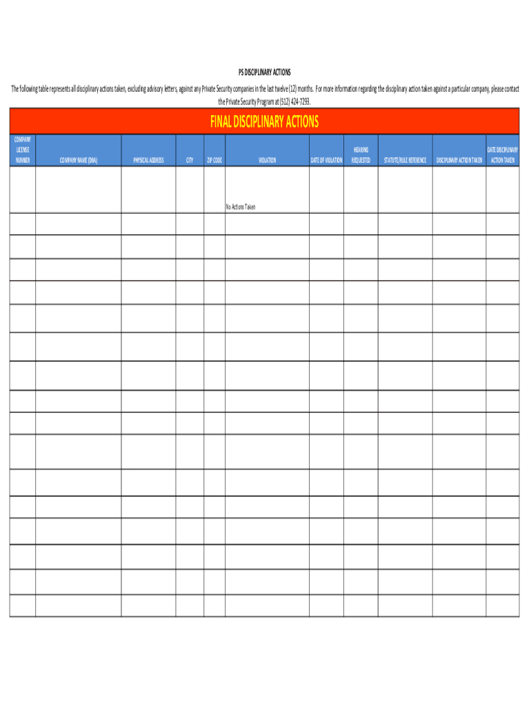 PSDISCIPLINARYACTIONS Thefollowingtablerepresentsalldisciplinaryactionstaken, excludingadvisoryletters, againstanyPrivateSecuritycompaniesinthelasttwelve(12)months. Formoreinformationregardingthedisciplinaryactiontakenagainstaparticularcompany,