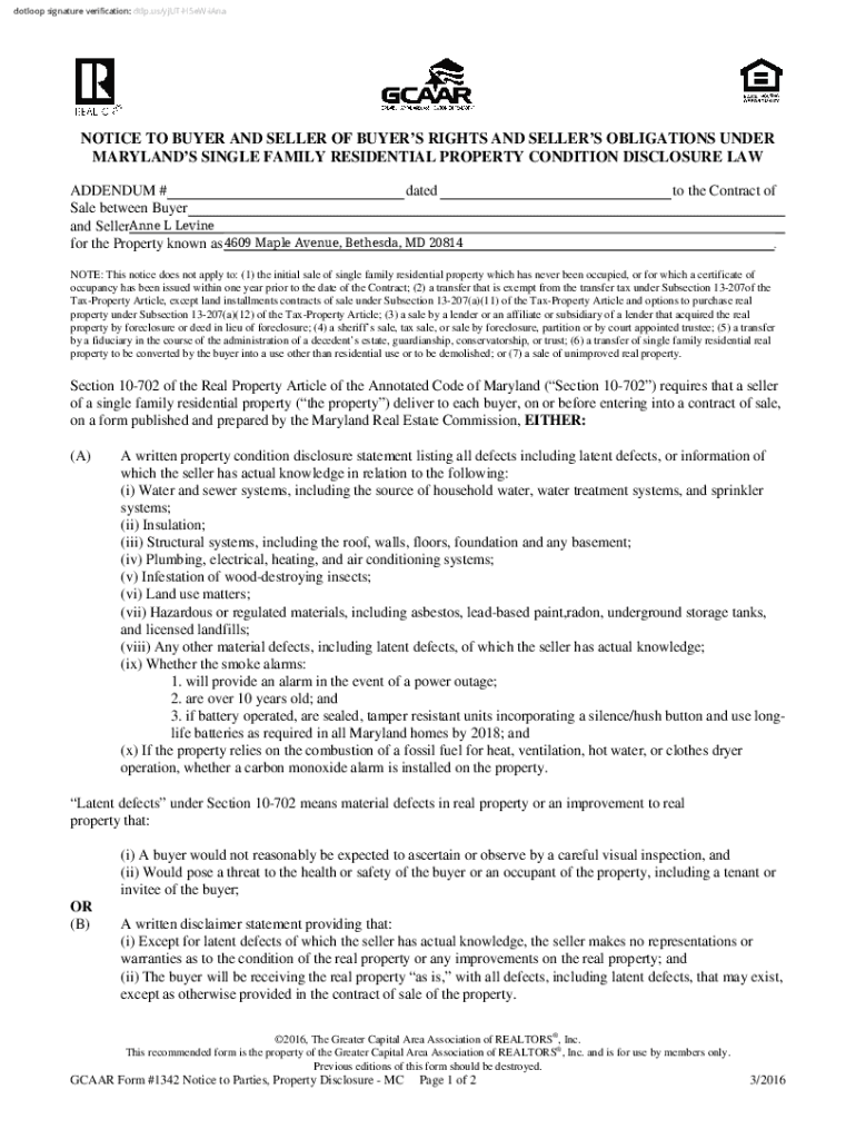 Dot loop signature verification: dtlp.us/yjUTH5eWiAnaNOTICE TO BUYER AND SELLER OF BUYERS RIGHTS AND SELLERS OBLIGATIONS UNDER MARYLAND SINGLE FAMILY RESIDENTIAL PROPERTY CONDITION DISCLOSURE LAW