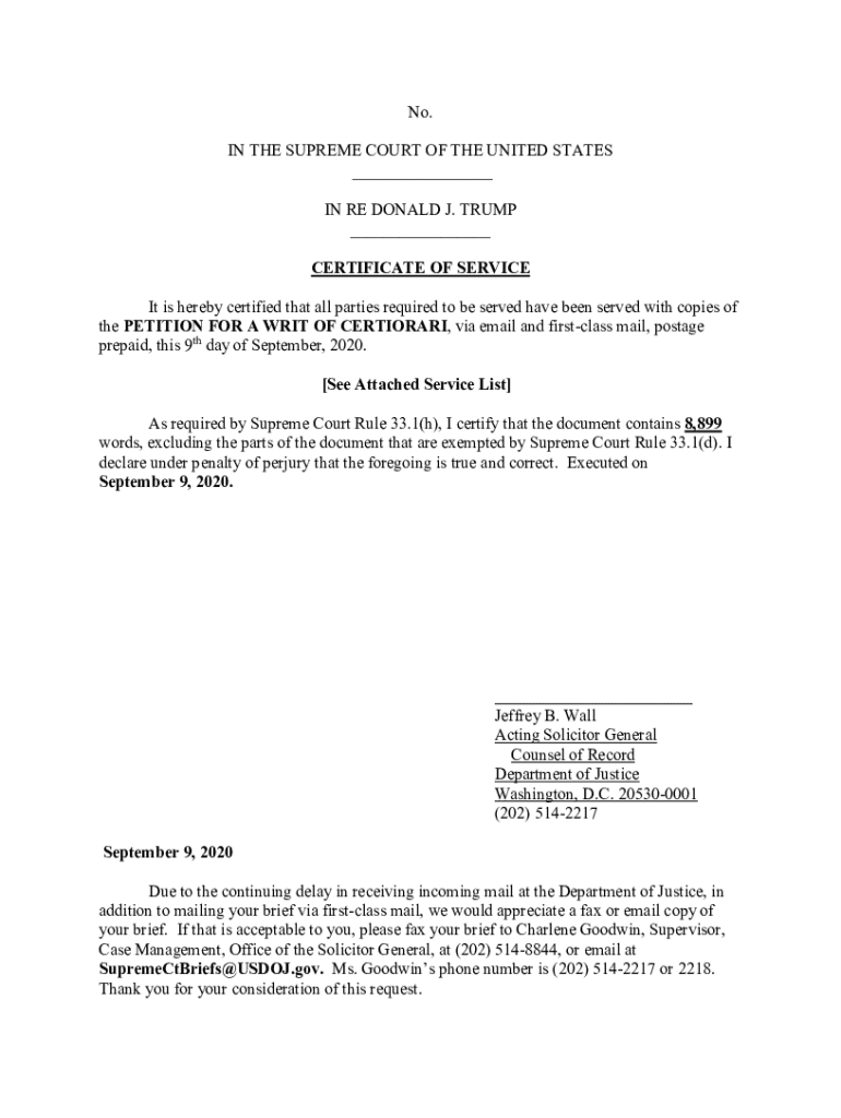 No. IN THE SUPREME COURT OF THE UNITED STATES ___ IN RE DONALD J. TRUMP ___ CERTIFICATE OF SERVICE It is hereby certified that all parties required to be served have been served with copies of the
