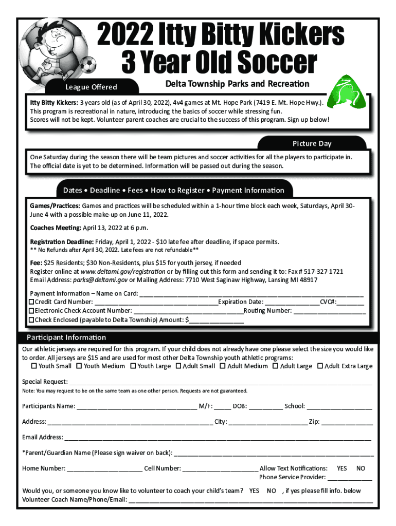 2022 Kitty Bitty Kickers 3-Year-Old SoccerLeague Offered Delta Township Parks and Recreationally Bitty Kickers: 3 years old (as of April 30, 2022), 4v4 games at Mt. Hope Park (7419 E. Mt. Hope Hwy.).