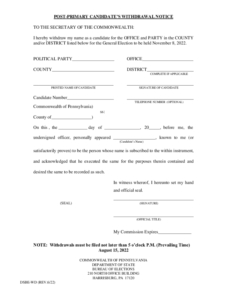 PRE-PRIMARY CANDIDATES WITHDRAWAL NOTICE TO THE SECRETARY OF THE COMMONWEALTH: I hereby withdraw my name as a candidate for the OFFICE and PARTY in the COUNTY and/or DISTRICT listed below for the