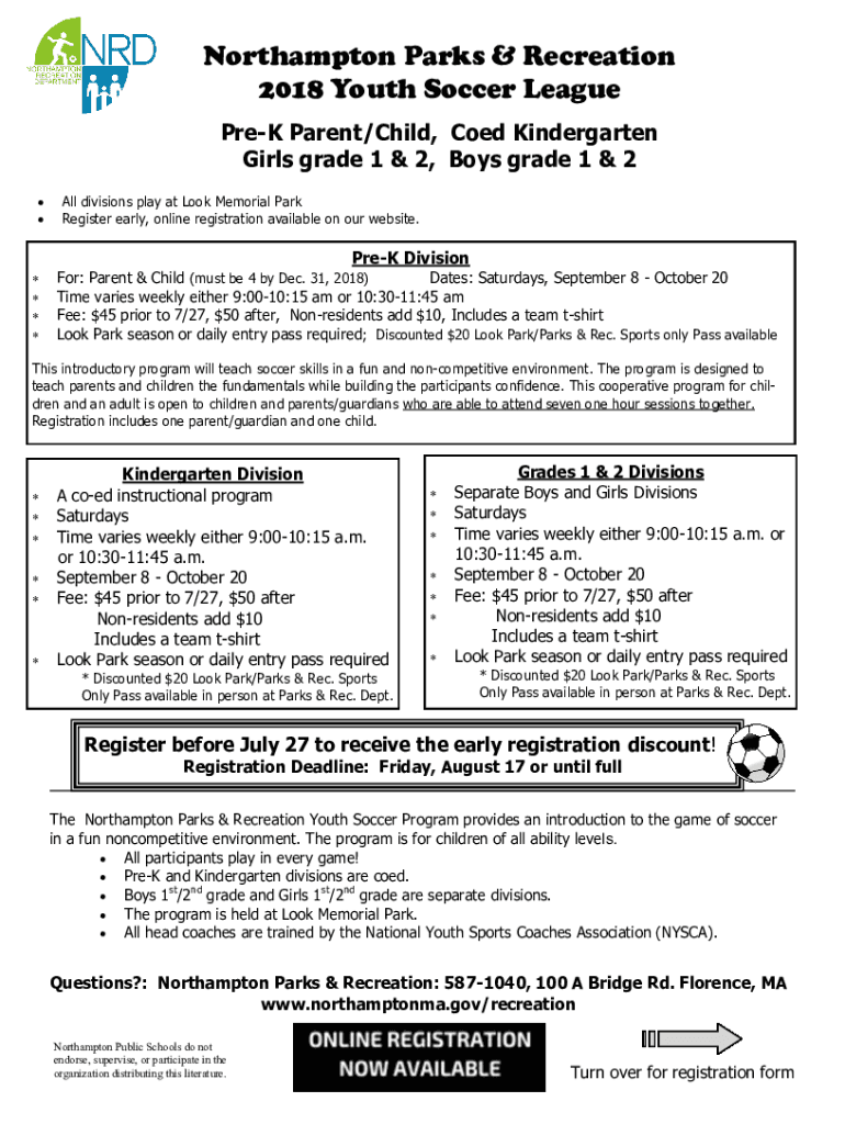 Northampton Parks & Recreation 2018 Youth Soccer League Prey Parent/Child, Coed Kindergarten Girls grade 1 & 2, Boys grade 1 & 2 All divisions play at Look Memorial Park Register early, online registration