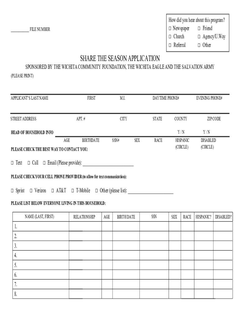 The Share the Season Application is a personal form used by residents of Kansas to request financial assistance from local organizations like the Wichita Community Foundation and The Salvation Army.
