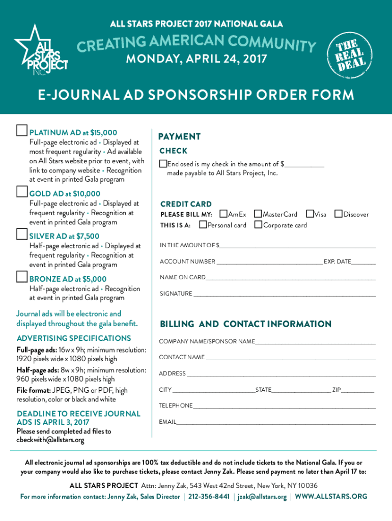 MONDAY, APRIL 24, 2017EJOURNAL AD SPONSORSHIP ORDER FORM ____________PLATINUM AD at $15,000 Full page electronic ad Displayed at most frequent regularity Ad available on All Stars website prior to
