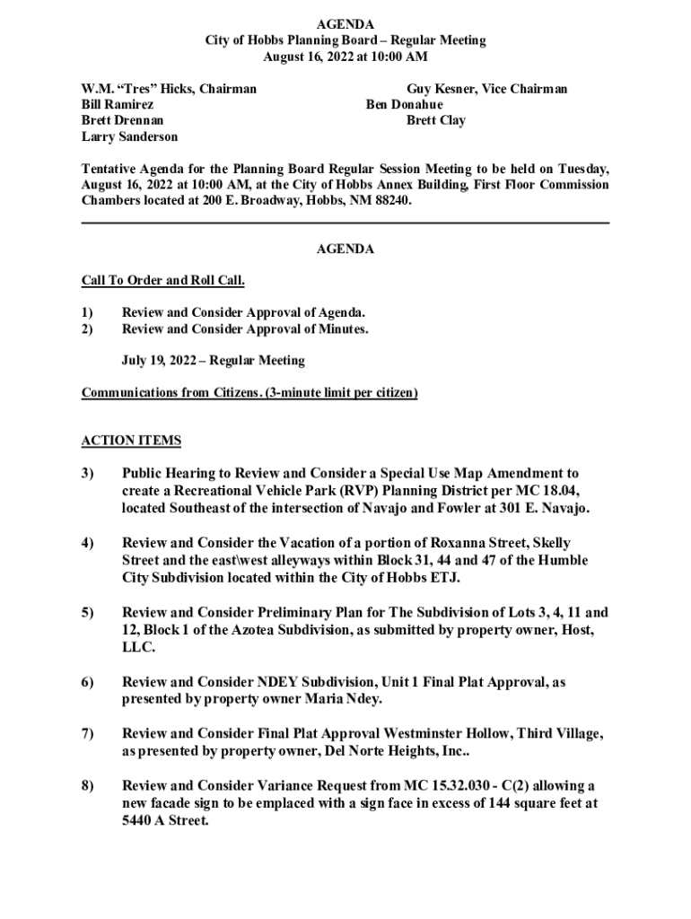 AGENDA City of Hobbs Planning Board Regular Meeting August 16, 2022, at 10:00 AM W.M. Tree Hicks, Chairman Bill Ramirez Brett Brennan Larry Sanderson Keener, Vice Chairman Ben Donahue Brett ClayTentative