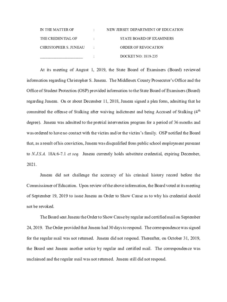 IN THE MATTER OF:NEW JERSEY DEPARTMENT OF EDUCATION CREDENTIAL OF:STATE BOARD OF EXAMINERSCHRISTOPHER S. JUNEAU:ORDER OF REVOCATION___:DOCKET NO: 1819235At its meeting of August 1, 2019, the State