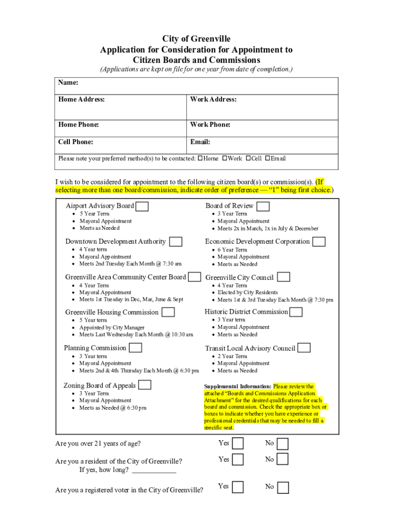 City of Greenville Application for Consideration for Appointment to Citizen Boards and Commissions(Applications are kept on file for one year from date of completion.) Name: Home Address:Work Address:Home