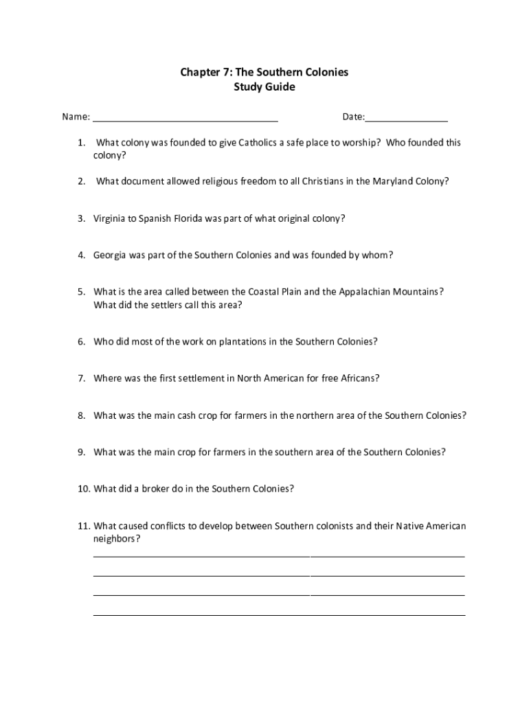 Chapter 7: The Southern Colonies Study Guide Name: ___Date:___1. What colony was founded to give Catholics a safe place to worship? Who founded this colony? 2. What document allowed religious freedom