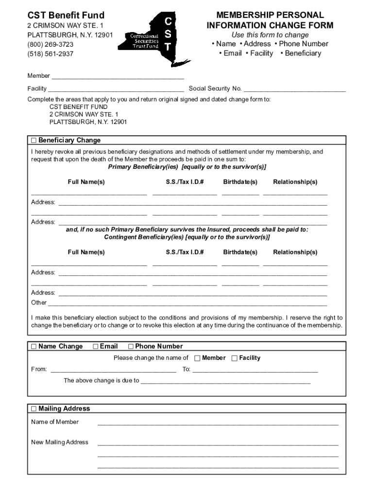 MEMBERSHIP PERSONAL INFORMATION CHANGE FORM CST Benefit Fund2 CRIMSON WAY STE. 1 PITTSBURGH, N.Y. 12901 (800) 2693723 (518) 5612937Use this form to change Name Address Phone Number Email Facility