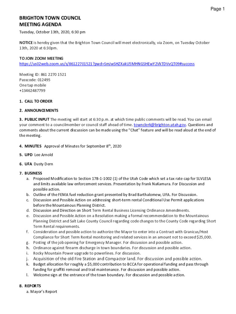 Page 1BRIGHTON TOWN COUNCIL MEETING AGENDA Tuesday, October 13th, 2020, 6:30 pm NOTICE is hereby given that the Brighton Town Council will meet electronically, via Zoom, on Tuesday, October 13th,