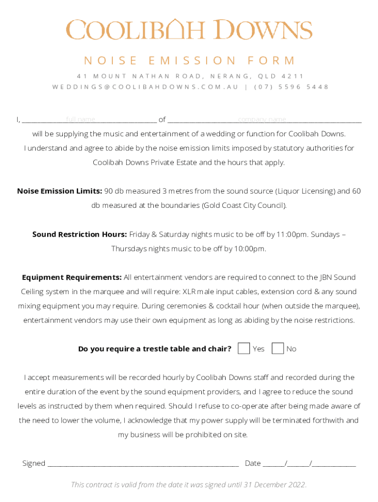 NOISE 41MOUNTEMISSIONNATHANROAD,BOOMERANG, WEDDINGS@COOLIBAHDOWNS.COM.AU|QLD (07)4211 55965448full name company name I, ___ of ___will be supplying the music and entertainment of a wedding or function