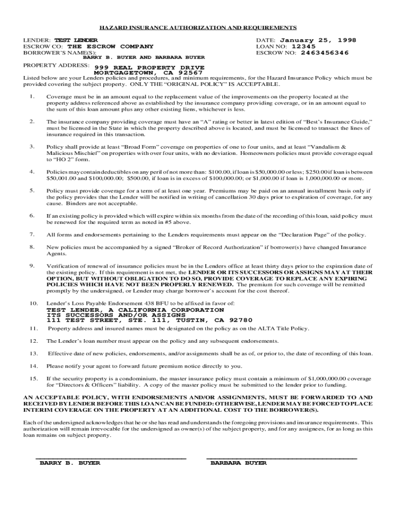 HAZARD INSURANCE AUTHORIZATION AND REQUIREMENTS LENDER: TEST LENDER ESCROW CO: THE ESCROW COMPANY BORROWERS NAME(S): BARRY B. BUYER AND BARBARA BUYER PROPERTY ADDRESS:DATE: January 25, 1998, LOAN