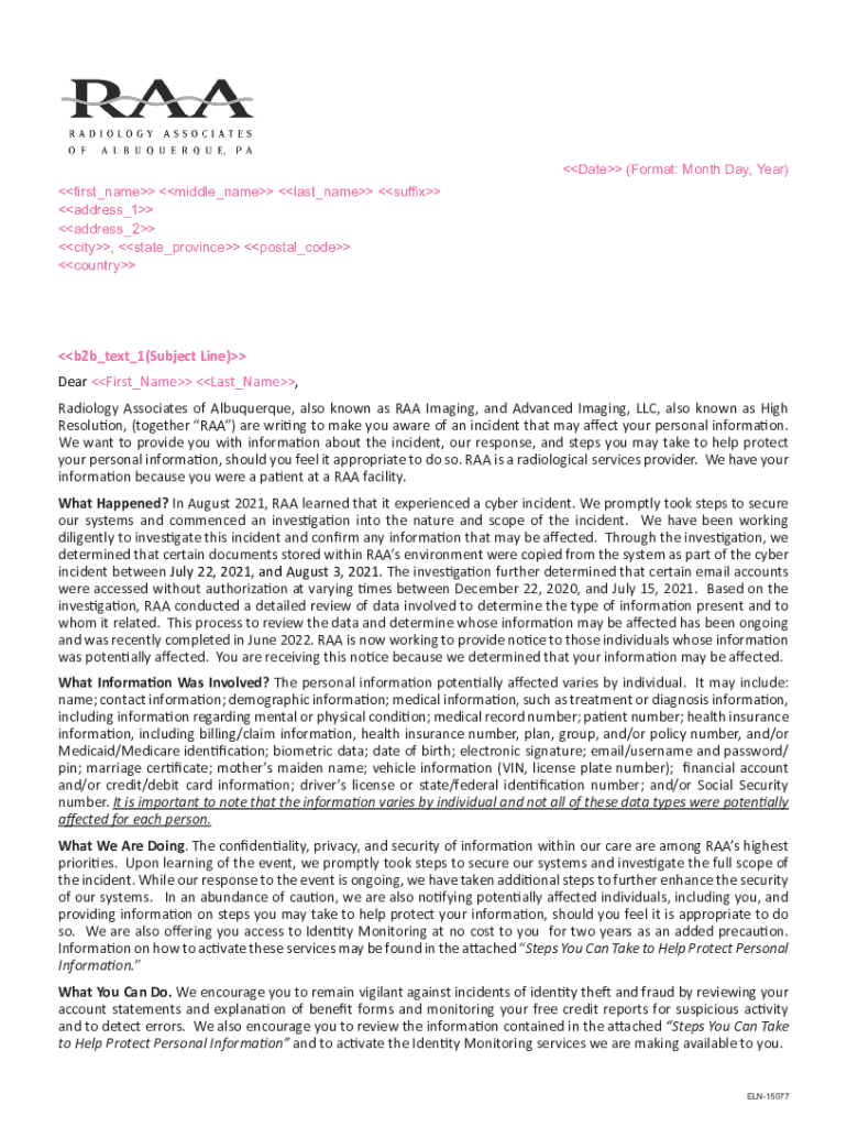 Date (Format: Month Day, Year) first_name middle_name last_name suffix address_1 address_2 city, state_province postal_code countryb2b_text_1(Subject Line) Dear First_Name Last_Name, Radiology Associates