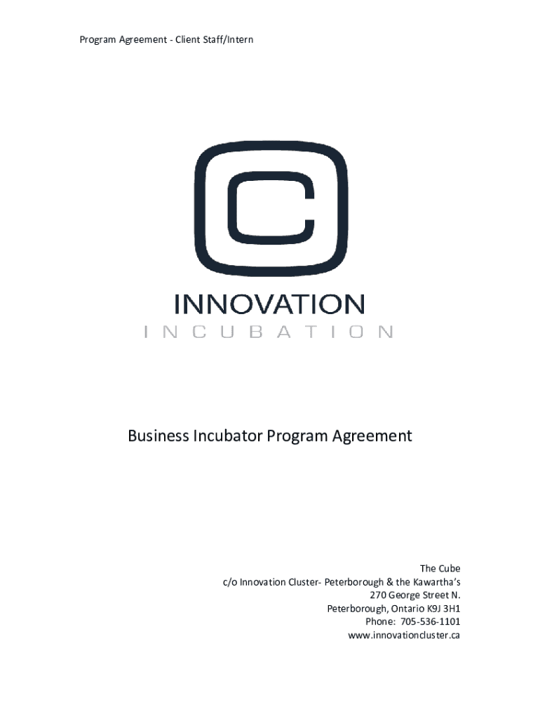Program Agreement Client Staff/InternBusiness Incubator Program Agreement Cube c/o Innovation Cluster Peterborough & the Kamānchas 270 George Street N. Peterborough, Ontario K9J 3H1 Phone: 7055361101