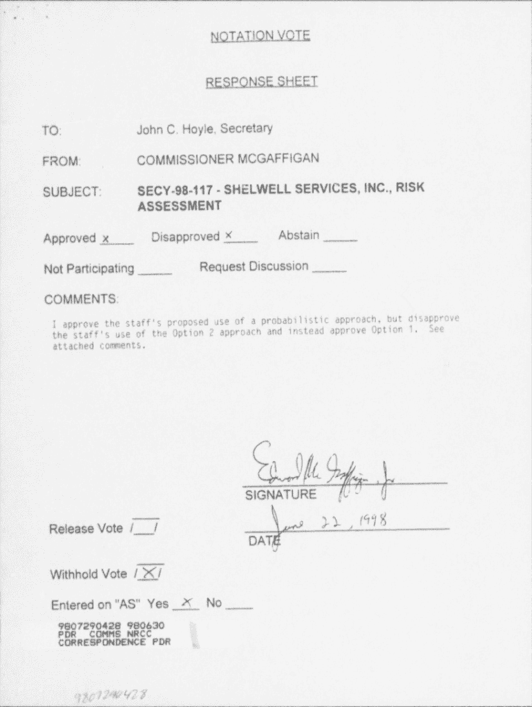_ _ _ _ _ _ _ _ _ _ _ _ _ _ _ __ _ _ _ _ _ _ _ _ ___ _ _ _ _ _ _ _ _ _ _ ___, ....NOTATION VOTE|.1, 1RESPONSE SHEET John C. Hoyle, Secretary TO: FROM:.SUBJECT:commissioner MCGAFFIGANtSECY98117 SEWELL