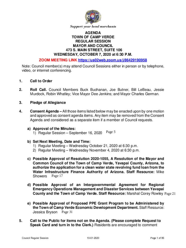 Support your local merchantsAGENDA TOWN OF CAMP VERDE REGULAR SESSION MAYOR AND COUNCIL 473 S. MAIN STREET, SUITE 106 WEDNESDAY, OCTOBER 7, 2020, at 6:30 P.M. ZOOM MEETING LINK https://us02web.zoom.us/j/86429190958