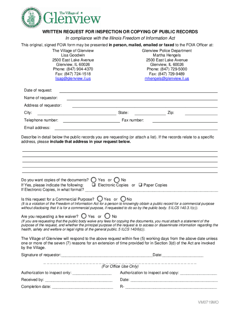 IL Written Request for Inspection or Copying of Public Records - Village of Glenview 2019 free printable template
