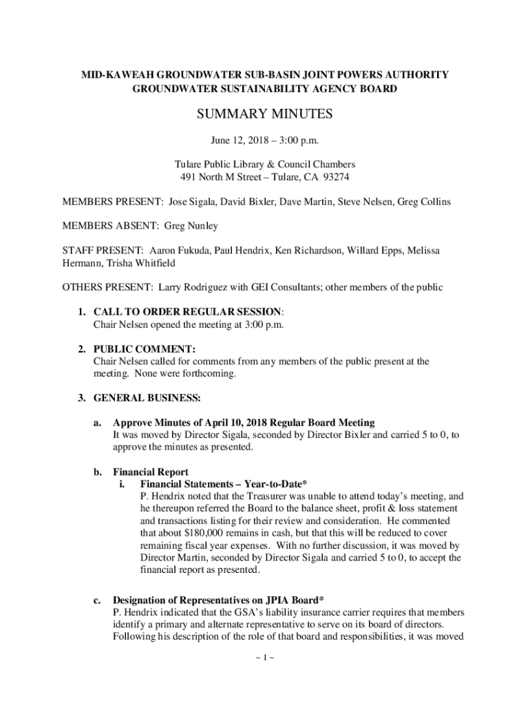 MIDKAWEAH GROUNDWATER BASIN JOINT POWERS AUTHORITY GROUNDWATER SUSTAINABILITY AGENCY BOARDSUMMARY MINUTES June 12, 2018 3:00 p.m. Tulane Public Library & Council Chambers 491 North M Street Tulane,