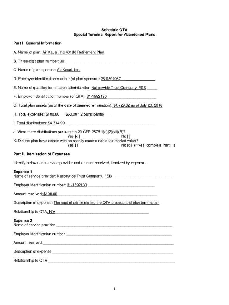 Schedule MTA Special Terminal Report for Abandoned Plans Part I. General Information A. Name of plan: Air Kauai, Inc 401(k) Retirement Plan B. Three digit plan number: 001___ C. Name of plan sponsor:
