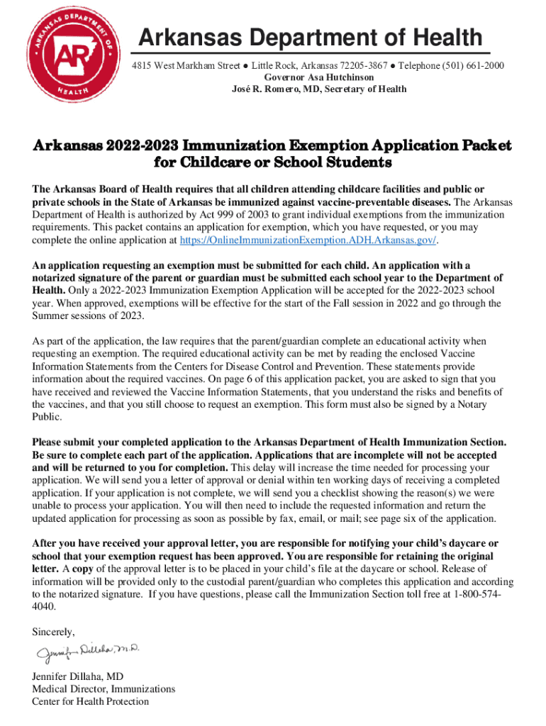 Arkansas Department of Health 4815 West Markham Street Little Rock, Arkansas 722053867 Telephone (501) 6612000 Governor Asa Hutchinson Jo's R. Romero, MD, Secretary of Health Arkansas 20222023 Immunization
