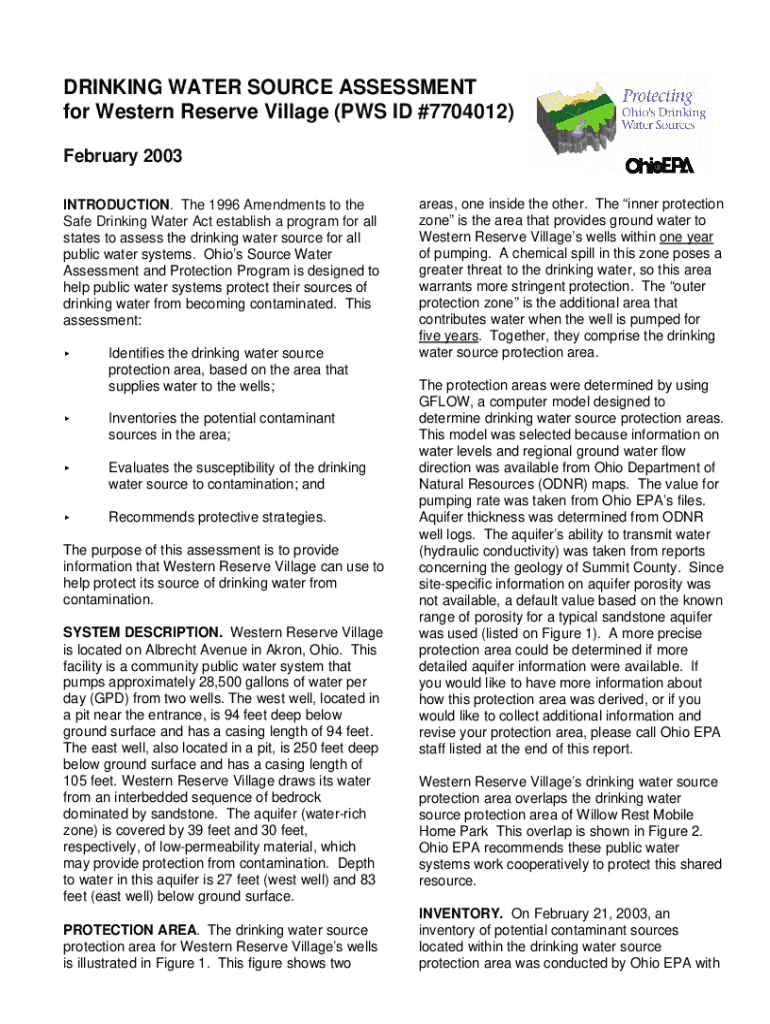 DRINKING WATER SOURCE ASSESSMENT for Western Reserve Village (PCs ID #7704012) February 2003 INTRODUCTION. The 1996 Amendments to the Safe Drinking Water Act establish a program for all states to