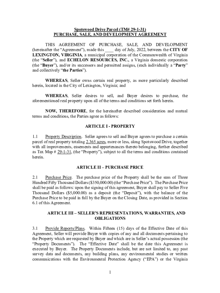 Spots wood Drive Parcel (TM# 29131) PURCHASE, SALE, AND DEVELOPMENT AGREEMENT THIS AGREEMENT OF PURCHASE, SALE, AND DEVELOPMENT (hereinafter the Agreement), made this ___ day of July 2022, between